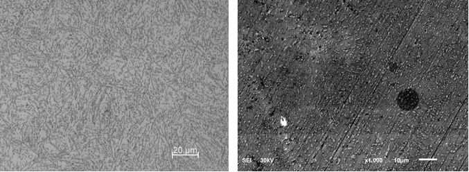 选取同批车加工后热处理前套圈制成金相试样,经腐蚀后分别在金相显微镜和扫描电镜下观察,正常区域球化退火组织如图3所示,正常区域均匀分布细小的球状和粒状碳化物;靠近套圈表面区域球化退火组织如图4所示,相比正常区域,靠近表面区域碳化物分布明显减少,且部分呈链状分布,类似于9Cr18钢退火孪晶状碳化物。