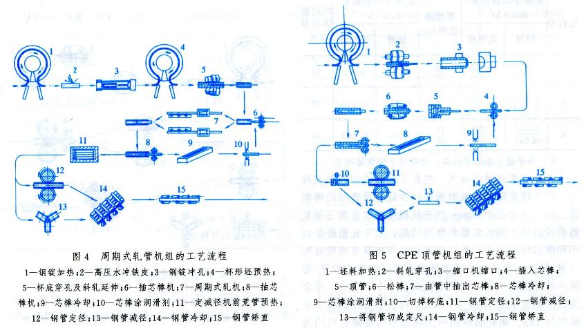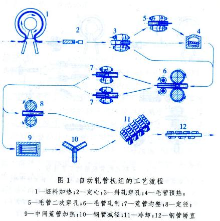 生产热轧无缝管的机组,根据穿孔、延伸和精轧3个基本工序中使用的生产方法和设备的不同,可以有各种不同。不同的机组均以将毛管展轧延伸成荒管的轧机来命名。例如,有自动轧管机的称自动轧管机组,有连续轧管机的称连续轧管机组,在三辊(或二辊)斜轧延伸机上展轧毛管的称三辊(或二辊)轧管机组,用周期式轧管机轧管的称周期式轧管机组,用CPE顶管机顶管的称CPE顶管机组。在这些机组上热轧无缝管的工艺流程分别如图1~图5所示。