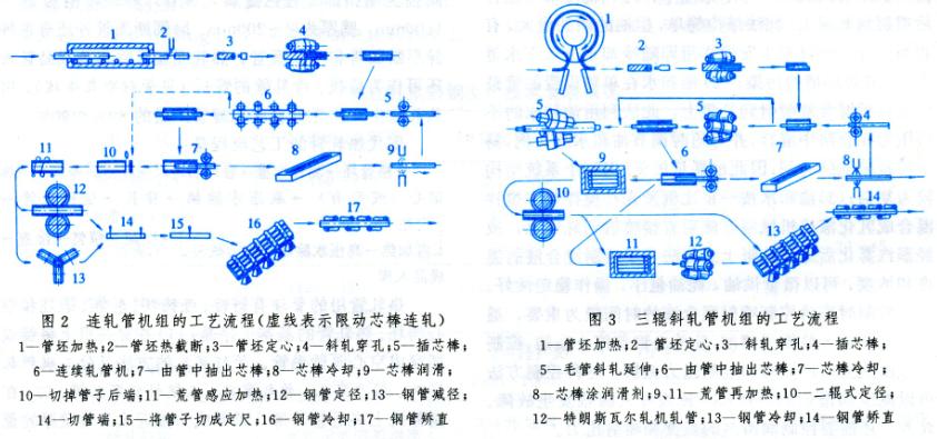 热轧管用的管坯有铸锭、连铸坯、轧坯、锻坯和空心铸坯。热轧管的基本工序是:(1)在穿孔机上将锭或坯穿成空心厚壁毛管。管坯穿孔的方法又分二辊斜轧穿孔、压力穿孔、推轧穿孔、三辊斜轧穿孔等。(2)在延伸机上将毛管轧薄,延伸成为接近成品管壁厚的荒管。毛管延伸即毛管轧制的方法有:自动轧管机轧管,连续轧管机轧管,三辊和二辊轧管机斜轧(见管材料轧延伸),周期式轧管机轧管,顶管机顶管。(3)荒管在精轧机上精轧成成品管。荒管精轧包括以改善质量为目的的管材均整和管材定径以及以扩大产品规格为目的的管材减径和管材热扩径。