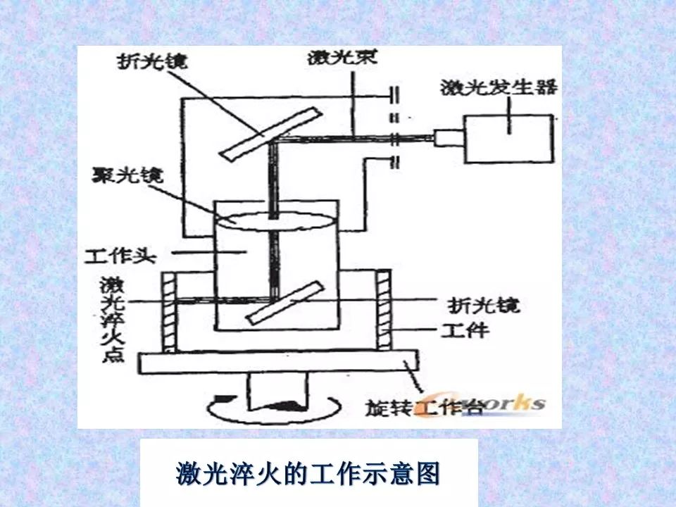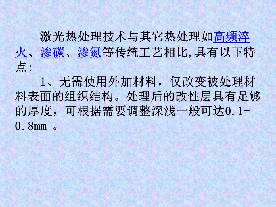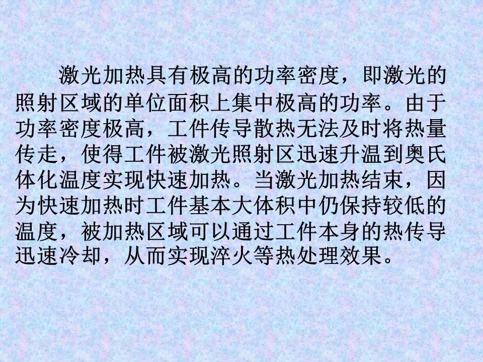 激光热处理具有加热速度快,加热到相变温度以上仅需要百分之几秒;淬火不用冷却介质,而是靠工件自身的热传导自冷淬火;光斑小,能量集中,可控性好,可对复杂的零件进行选择加热淬火;能细化晶粒,显著提高表面硬度和耐磨性;淬火后,几乎无变形,且表面质量好等优点。主要用于精密零件的局部表面淬火,也可对微孔、沟槽、盲孔等部位进行淬火。