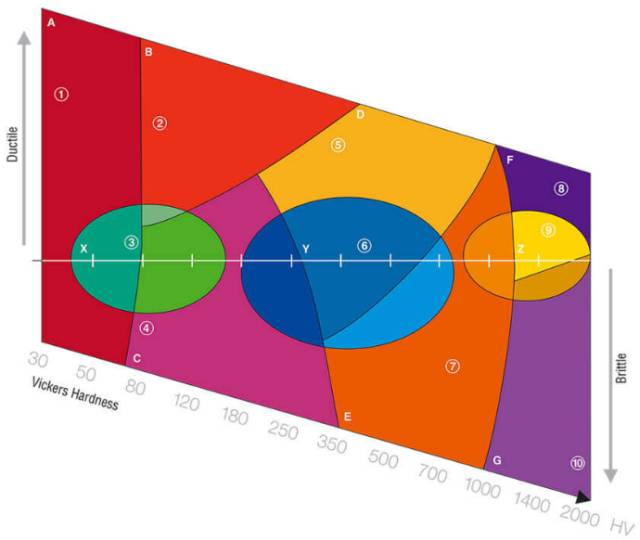 依据材料的韧性向下或向上查,与硬度不同的是,韧性较难以确定其准确数值,一般依照个人的经验定出后,在Y轴上找出材料的位置。