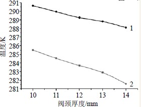 2)阀盖长颈部壁厚对填料函温度场分布有一定影响。随着厚度增加,换热面积增大同时热阻增加,填料函温度降低,因此在保证阀盖长颈部强度要求的基础上,阀盖壁厚应取较小值。(长颈部壁厚对填料函温度场影响曲线见图3)
