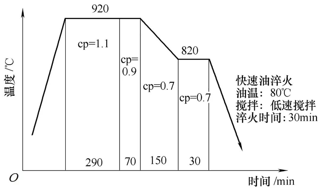 图4是原淬火工艺,换用KR498淬火后,钟形壳的芯部硬度及硬化层深度均达到要求,但仍然有22%的工件变形量超出变形范围。考虑到碳势、渗碳时间、淬火温度及保温时间、淬火油温、搅拌频率等因素对变形的出现有重要影响,所以后期通过适当延长渗碳时间、提高淬火保温区碳势、提高淬火温度及保温时间、降低淬火油温、提高搅拌频率来降低钟形壳内腔的变形量;最终发现采用图5所示热处理工艺时,抽检530只零件,仅5%的零件变形超标,表2为变形超标的0458D型钟形壳热处理后内圈尺寸。