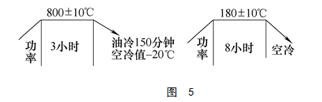 另外,将工件转至井式炉进行热处理,因为没有料盘,两工件分开,且井式炉天车为淬火天车,工件的冷却速度大大提高,再降低终冷反应温度,使其得到淬火马氏体。针对变形问题,我们在其淬火后,工件未入炉时,将把合工件的螺栓全部从新拧紧后,入炉回火。具体工艺如图5所示。