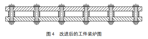 针对这种情况,我们改变了工艺,首先我们改进了工件把合的方法,在两工件间用套筒将其隔开,再把工件把合,减小淬火的截面积。如图4所示。