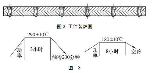 为防止工件变形,我们将工件每两件用螺栓把合在一起,淬火面朝外。如图2工件立装在料盘上,在台车炉上进行热处理,工艺如图3所示。