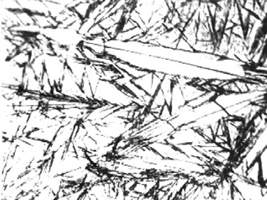 (4)马氏体(M):是碳在a-Fe中的过饱和固溶体。马氏体的形态按含碳量主要分两种,即板条状和针状(如图6、图7所示)