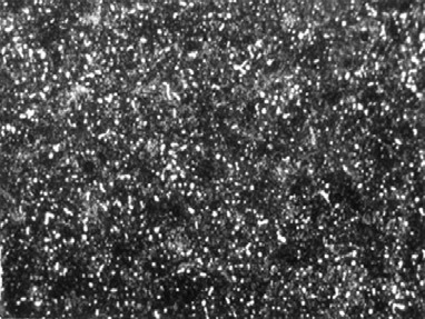 (5)残余奥氏体(A残) 是含碳量大于0.5%的奥氏体淬火时被保留到室温不转变的那部分奥氏体。它不易受硝酸酒精溶液的浸蚀,在显微镜下呈白亮色,分布在马氏体之间,无固定形态。在图8表示含碳1.2%的碳钢正常淬火(780℃加热),其组织为马氏体+粒状渗碳体+少量残余奥氏体。