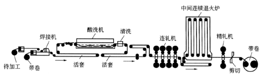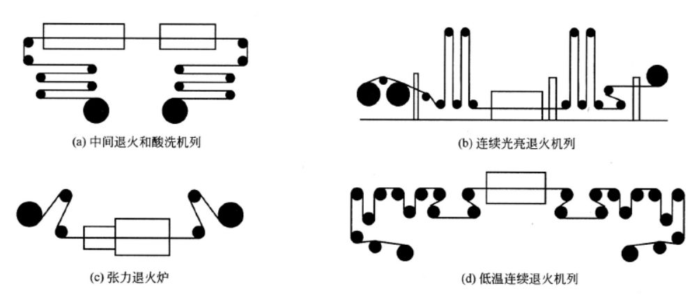 气垫式炉由开卷、焊接、脱脂、炉子、酸洗、剪切、卷取及辊、控制辊、活套塔等组成。图1为带材连续生产线的退火与酸洗机列示意图,图2为各种铜合金气垫式炉连续退火示意图。