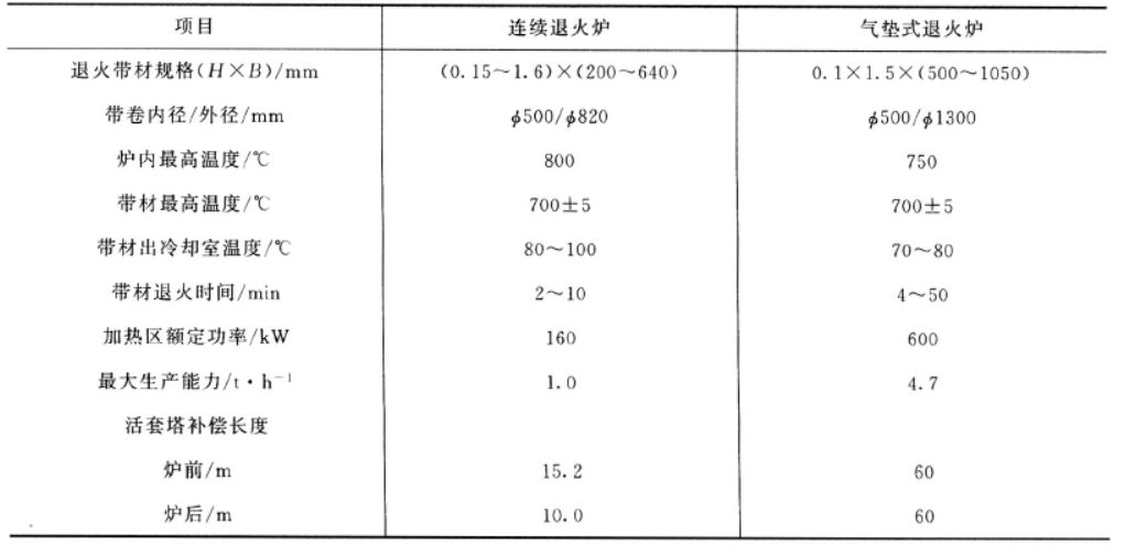 气垫式炉退火带材的最大厚度和最小厚度之比为10:15,最大宽度和最小宽度之比为2,同一条带厚与宽的比小于1/250。目前,可实现厚度0.05~1.5mm,宽度250~1100mm带材的退火,退火速度为(4~100)m/min,生产能力5t/h,热效率85%,热源采用电或燃气加热均可。
