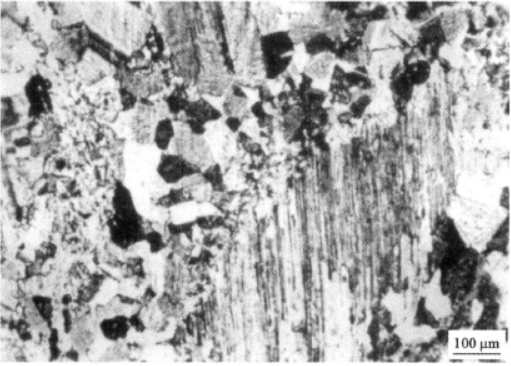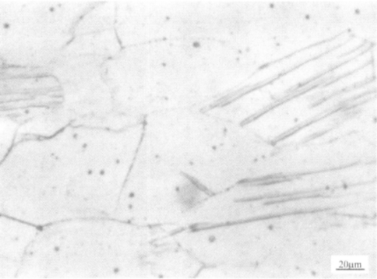 塑性变形使等轴β晶粒内产生孪晶(平直条纹)
