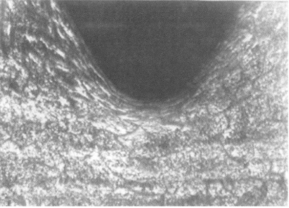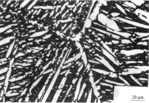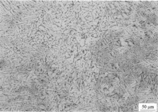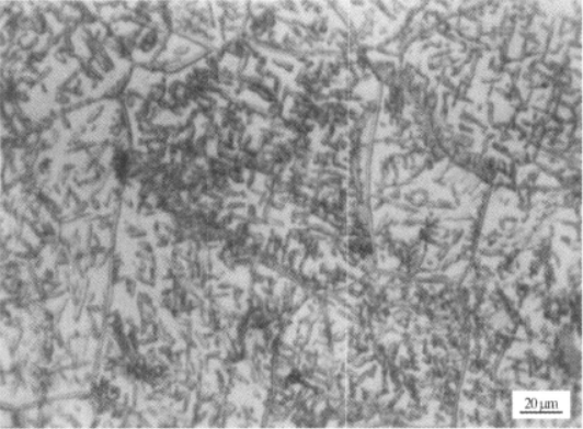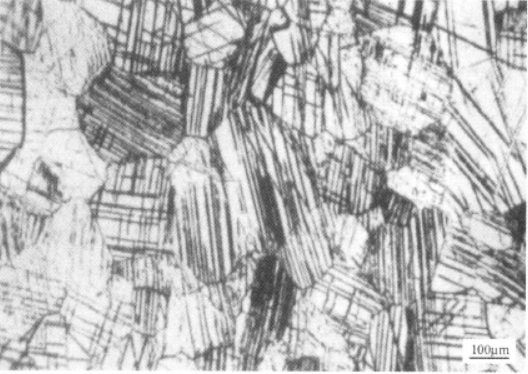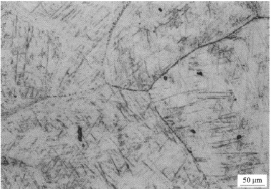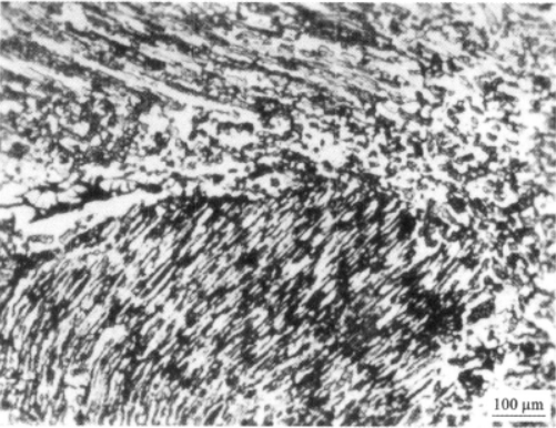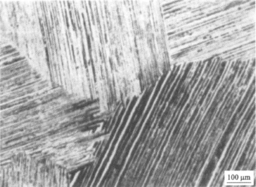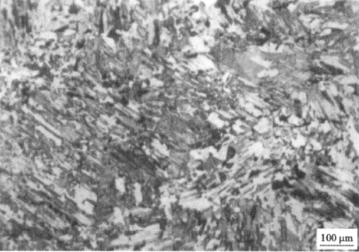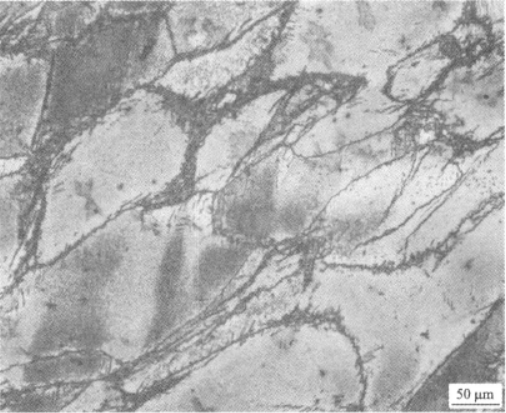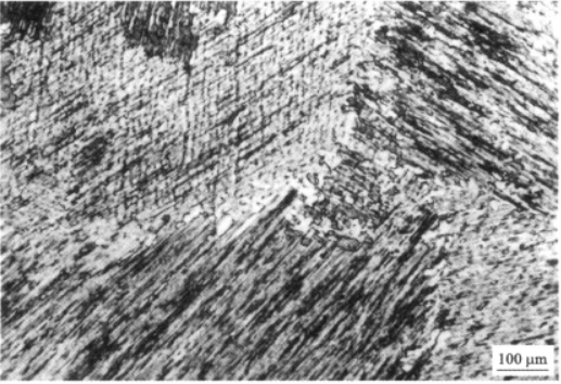 图5-2 Ti75合金管坯铸件经40%旋压变形,片状β转变组织呈弯曲状