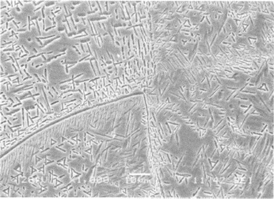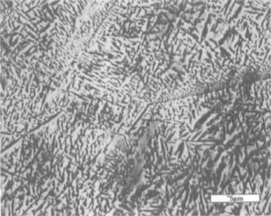 图3-49 Ti1300合金β相区固溶+时效组织:针状次生α(亮条)在β基体上析出