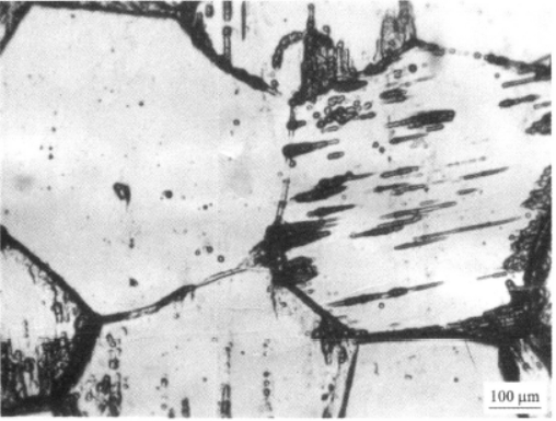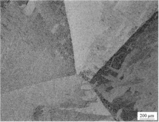 图5-1 Ti75合金管坯铸件组织,粗大原始β晶粒,基体为片状β转变组织