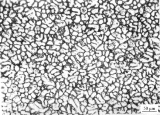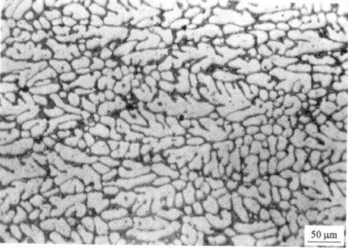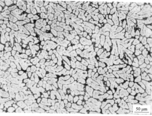 图4-14 Ti44Ni47Nb9Al1铸态组织初生树枝晶(亮)+共晶体(灰)