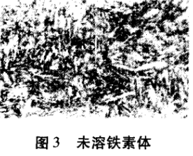如亚共析钢,当加热温度在 Ac3与 Ac1之间(例如25#钢淬火加热温度低于 860℃) 时, 因铁素体未完全溶入奥氏体,淬火后不能得到均匀一致的马氏体,得到的是铁素体和马氏体,影响工件硬度。从金相分析可见未溶铁素体 (如图3所示)。