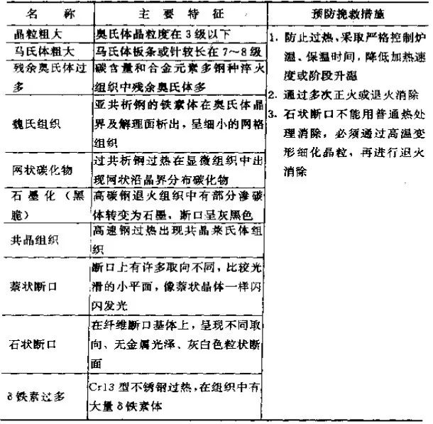 过热组织包括结构钢的晶粒粗大,马氏体粗大、残余奥氏体过多、魏氏组织,高速钢的网状碳化物、共晶组织(莱氏体组织)、萘状断口、马氏体不锈钢的铁素体过多、黄铜合金脱锌使表面出现白灰,酸洗后呈麻面等。