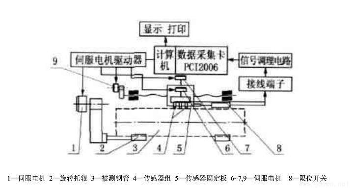2008年兰州理工大学材料科学与工程学院王宏等人进行了“基于虚拟仪器的大直径焊管的形位误差检测系统”的研究。其原理如图2所示伺服电机1通过相应的传动机构带动被测钢管旋转传感器组4安装在固定板5上固定板5固定在可沿钢管轴向运动的导轨滑块上使得钢管在旋转的同时传感器测量组沿钢管轴向运动以螺旋线方式采集钢管表面的形位参数钢管轴向放置在3个位移传感器采集钢管母线数据测量母线直线度另外3个测量钢管圆度通过位移传感器采集到的数据传送到PC机进传行处理得出直线度、圆度误差。这种测量方法具有成本低、数据通信方便等优点但是接触式测量测量比较繁琐只能针对钢管母线直线度的测量不能实现对钢管轴线直线度的测量由于工厂坏境恶劣所以抗干扰能力差。