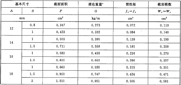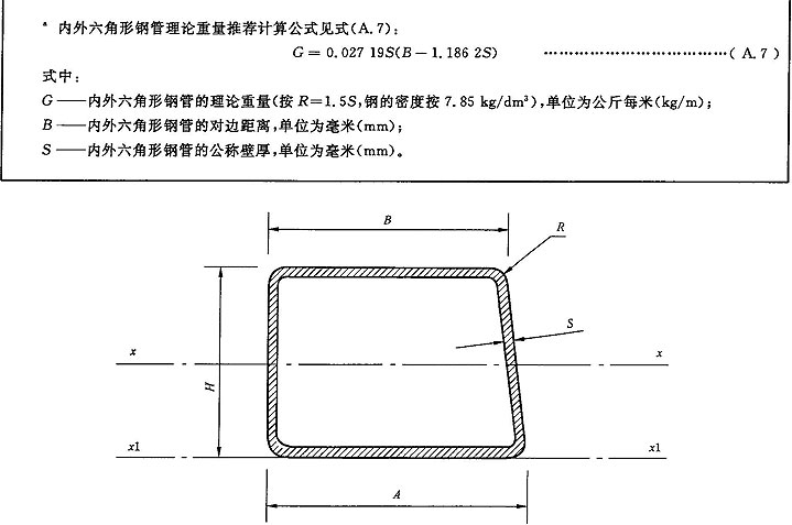 表A.5 内外六角形钢管的尺寸、理论重量和物理参数
