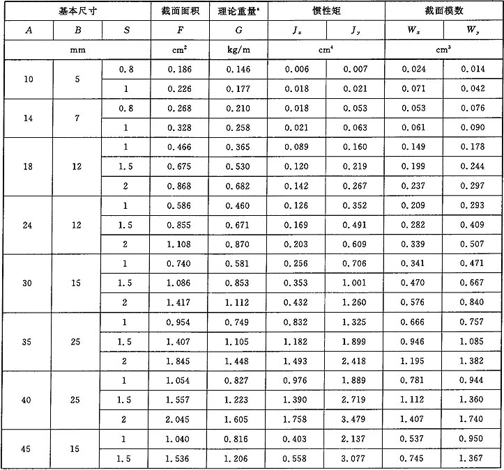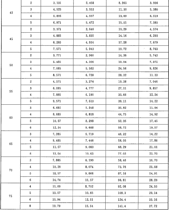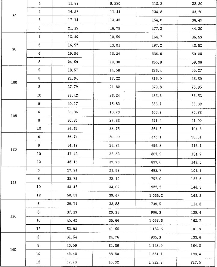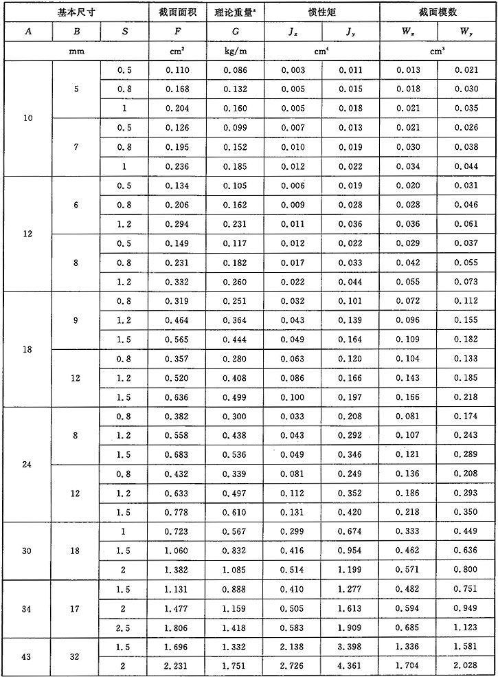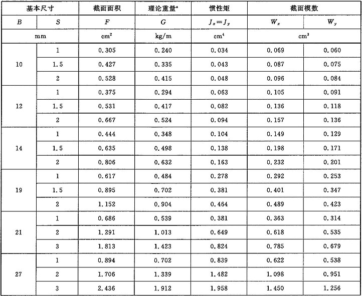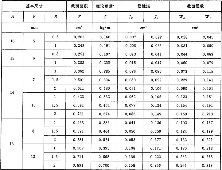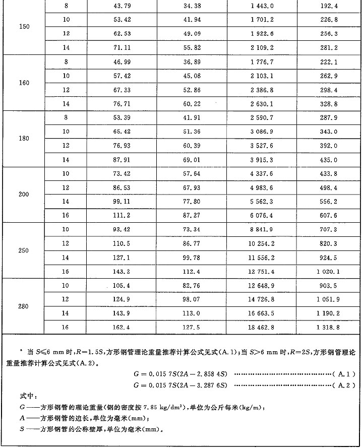 表A.1 方形钢管的尺寸、理论重量和物理参数