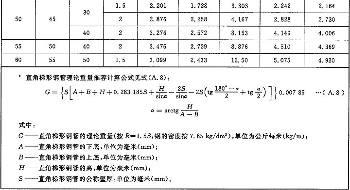 表A.6 直角梯形钢管的尺寸、理论重量和物理参数